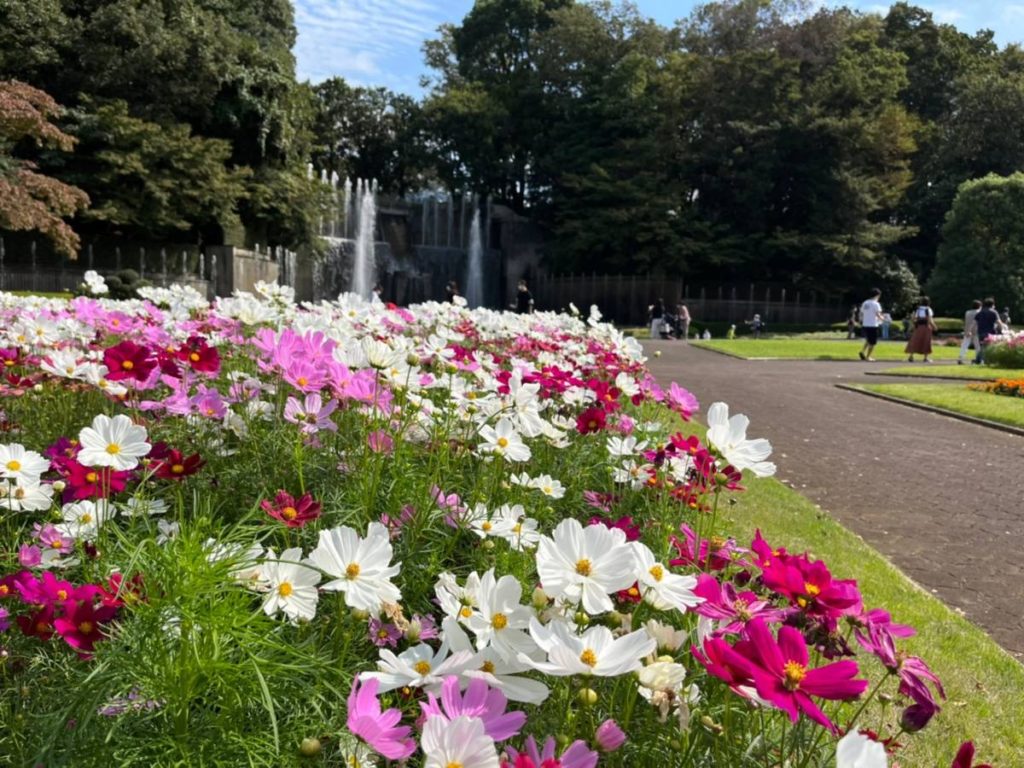 正門を通ってすぐのところに「花壇広場」があり、季節の花を楽しむことができます。